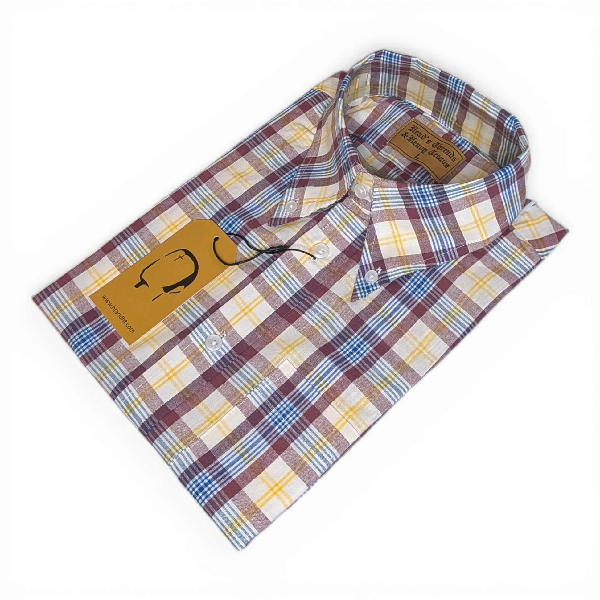 Maroon and cream open up the plaid while gold and royal blue lines cut through with energy and movement. On The Wire — live, loud, and always on the edge of something. This shirt carries the spirit of a late night when the music was right and nobody wanted it to stop. Multi-tone, full of life, and built with the same attention to detail as every HT&HT original. Three-button collar, full back pleat, locker loop, vented sleeves, and 65/35 cotton-poly that keeps its shape all night. Shop at htandht.com. Free worldwide shipping on button-downs.